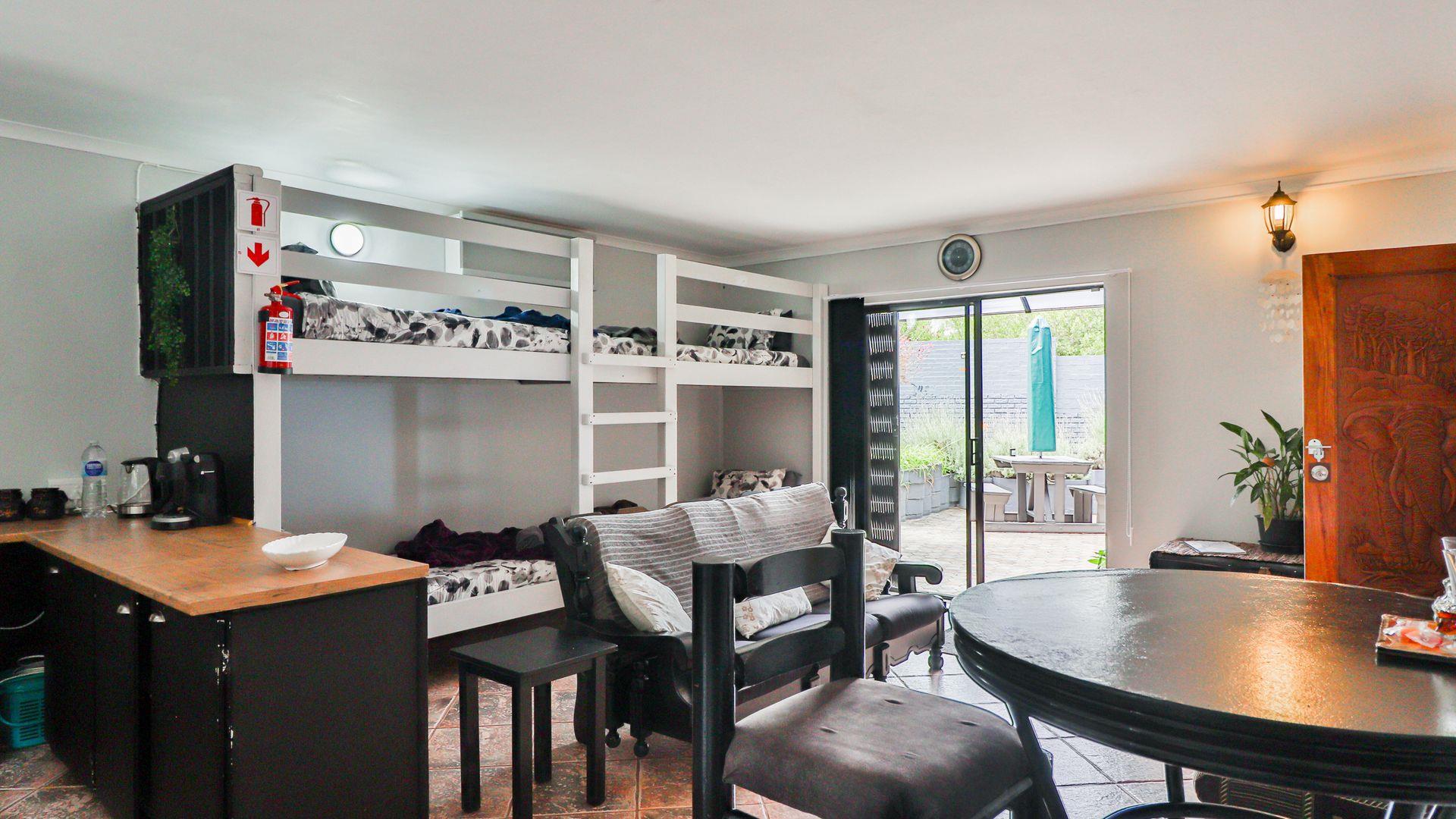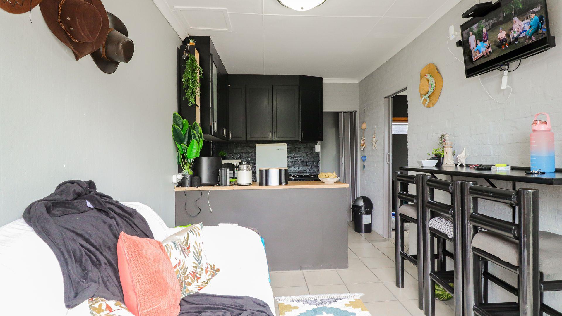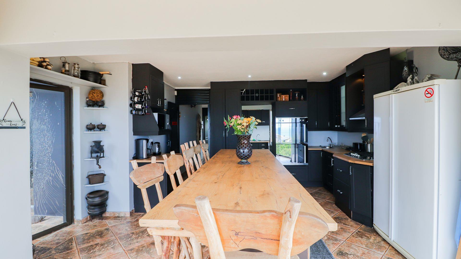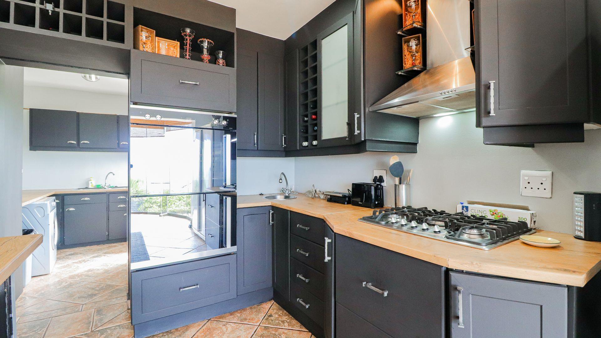 The ground level offers a warm, welcoming entrance leading into a spacious kitchen and comfortable living area perfectly suited for relaxed gatherings. Upstairs, a modern open-plan kitchen and dining space flows effortlessly onto a balcony fitted with a built-in braai, creating an idyllic setting for entertaining with a view.
