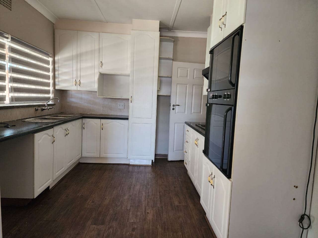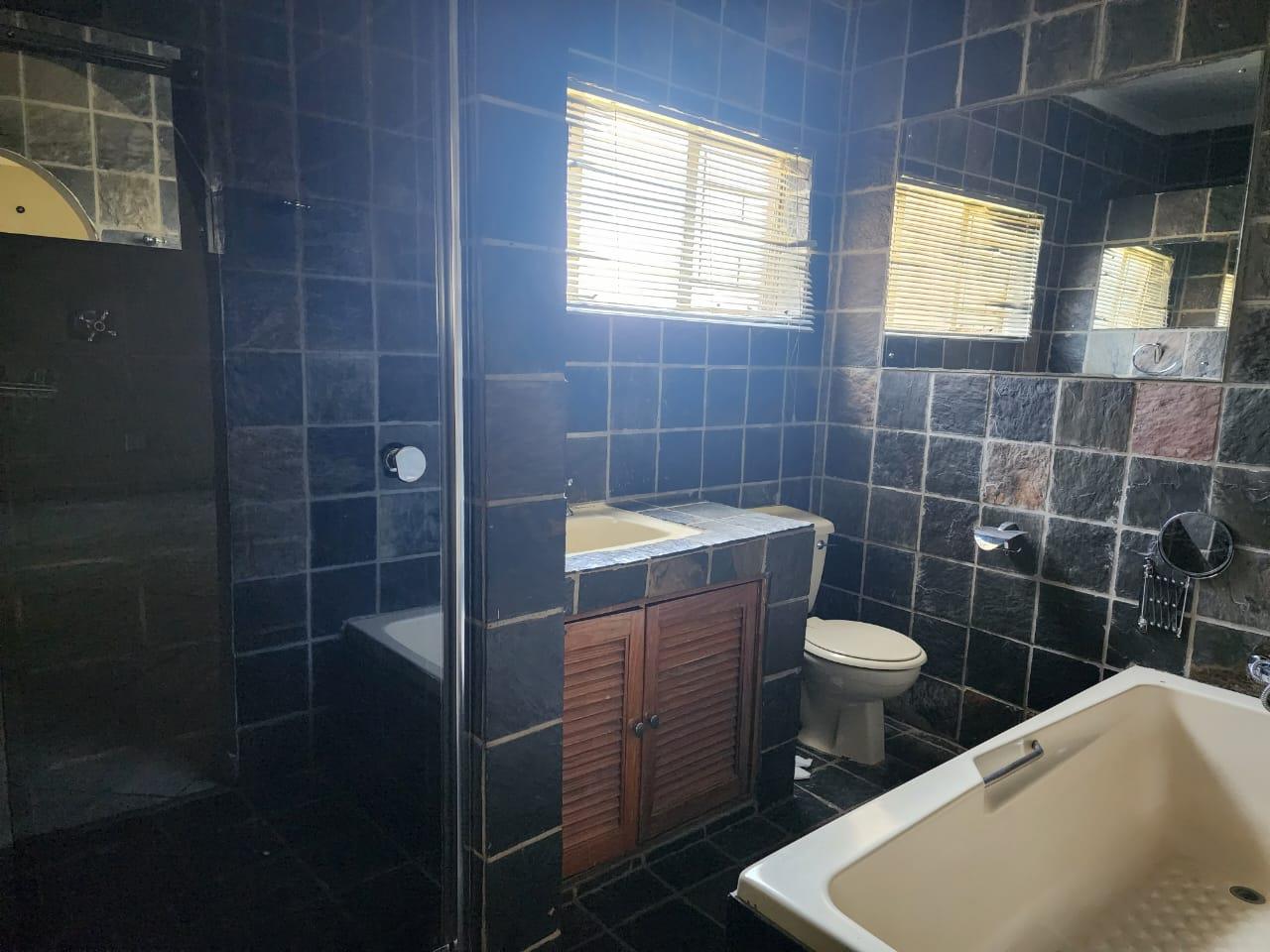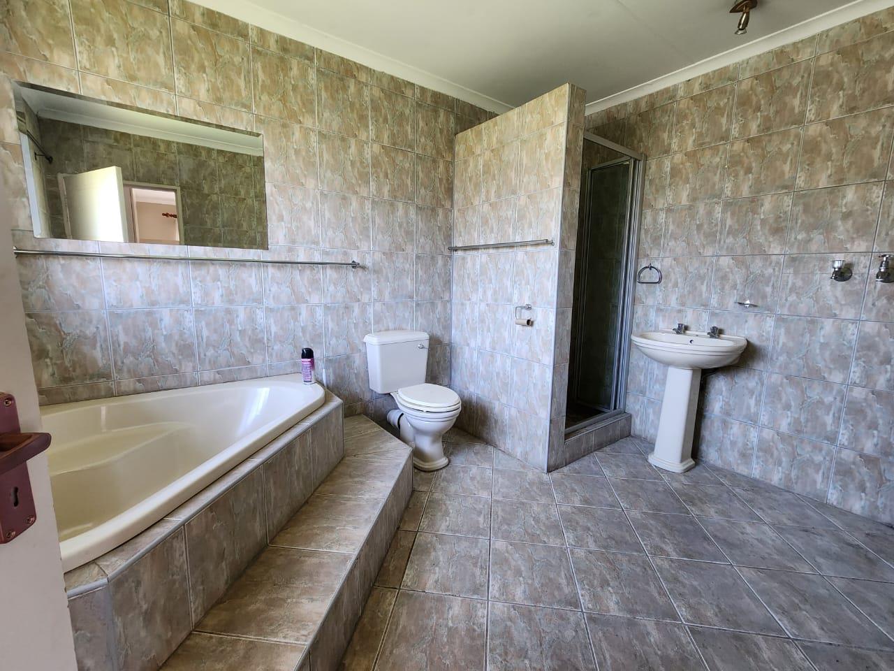 The house consists of 5 bedrooms (2 carpeted, 1 tiled, 1 laminated and 1 slate floor), 3 bathrooms (2 en-suite - one with bath, toilet, shower & basin - one with bath, toilet, basin and shower and space for a washing machine), family bathroom with shower & basin and separate toilet. Open plan Lounge & dining area. Kitchen with roller blinds, space for double door fridge and dishwasher and eye level oven and stove with extractor fan.
